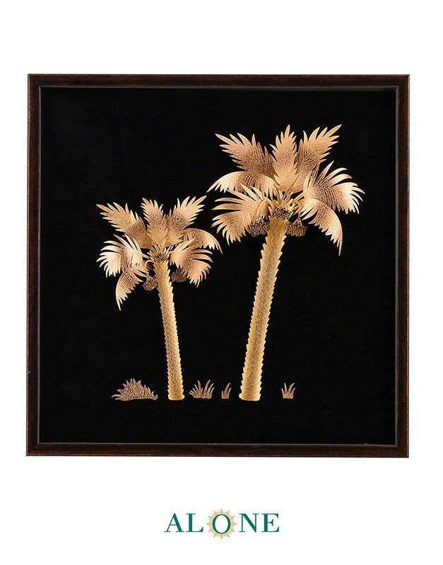 یکی از محصولات تولید شده توسط گروه تولیدی و هنری الون تابلوی ” اهل النخل قهوه ای” است. برای ساخت این تابلوی نفیس از ورقه های طلای 24 عیار (دارای گواهی استاندارد از متالوژی رازی)به ضخامت 92 میکرومتر استفاده شده که روی یک لایه پلیمر قرار گرفته است. الون با بهرمندی از گروه های متخصص و مبتکر با تلفیقی از تکنولوژی های نوین ، هنر های تجسمی و صنایع دستی این محصول زیبا را برای شما با نهایت دقت و ظرافت خلق کرده است. بسته بندی زیبا از مشخصه های این محصول است که میتوان از آن به عنوان هدیه ای زیبا و منحصر به فرد استفاده کرد. لازم به ذکر است محصولات الون دارای شناسنامه اصالت کالا می باشند.