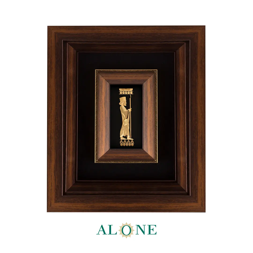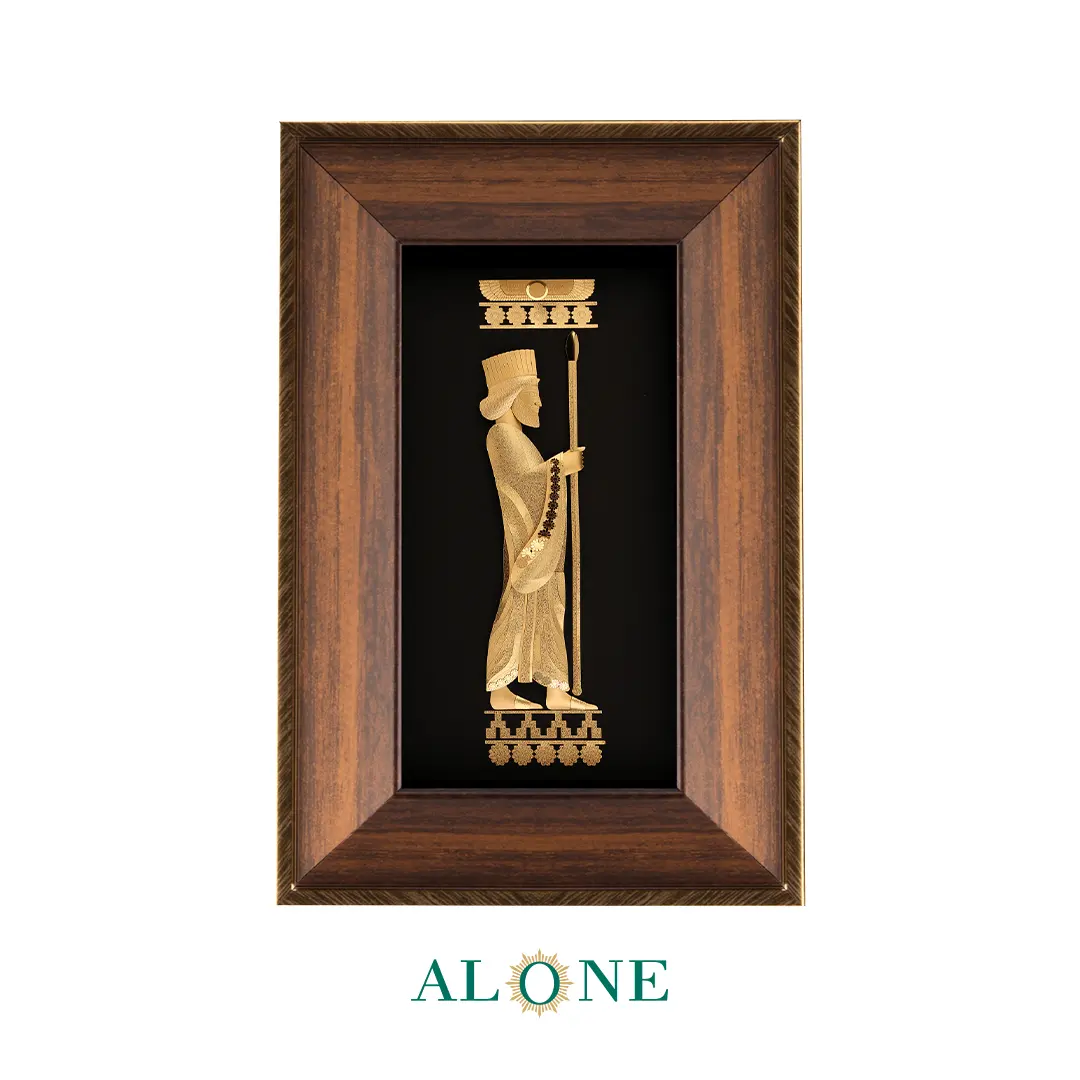یکی از محصولات تولید شده توسط گروه تولیدی و هنری الون ” تابلو مرد هخامنشی قهوه ای ” است. برای ساخت این تابلوی نفیس از ورقه های طلای 24 عیار (دارای گواهی استاندارد از متالوژی رازی)به ضخامت 92 میکرومتر استفاده شده که روی یک لایه پلیمر قرار گرفته است. الون با بهرمندی از گروه های متخصص و مبتکر با تلفیقی از تکنولوژی های نوین ، هنر های تجسمی و صنایع دستی این محصول زیبا را برای شما با نهایت دقت و ظرافت خلق کرده است. بسته بندی زیبا از مشخصه های این محصول است که میتوان از آن به عنوان هدیه ای زیبا و منحصر به فرد استفاده کرد. لازم به ذکر است محصولات الون دارای شناسنامه اصالت کالا می باشند.