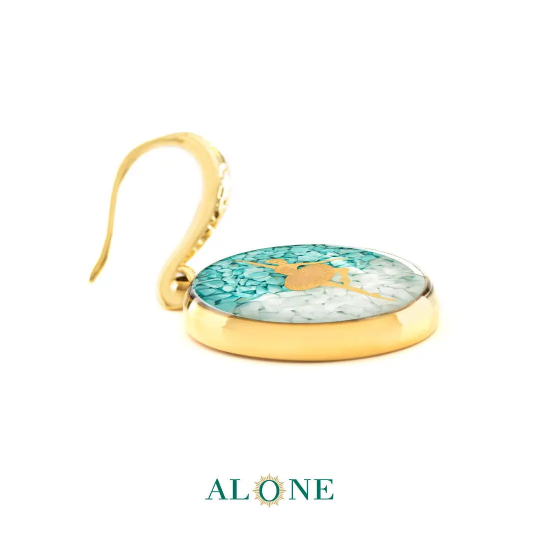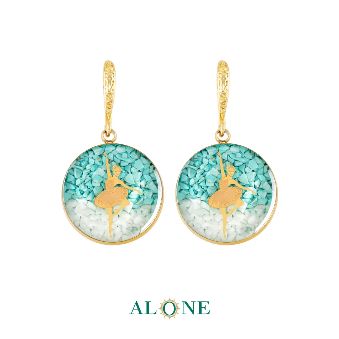 گوشواره رقص باله ترکیبی از استیل 316 با سنگ فیروزه می باشد. استیل 316 هیچ گونه حساسیتی برای پوست بدن ایجاد نمی کند، تیم طراحی الون نهایت دقت و خلاقیت را در تولید این محصول به کار بسته است. ترکیب رنگ بسیار زیبا به همراه کیفیت بالای ساخت این گوشواره از دیگر نکات قابل توجه است که این محصول را چشم نواز می کند. تنها طلای استفاده شده در این محصول نماد “رقص باله” است که از جنس ورق طلای 24 عیار مات و براق به ضخامت 92 میکرومتر ، بر روی یک لایه پلیمر قرار گرفته شده و رویه آن با یک لایه رزین پوشش داده شده است.